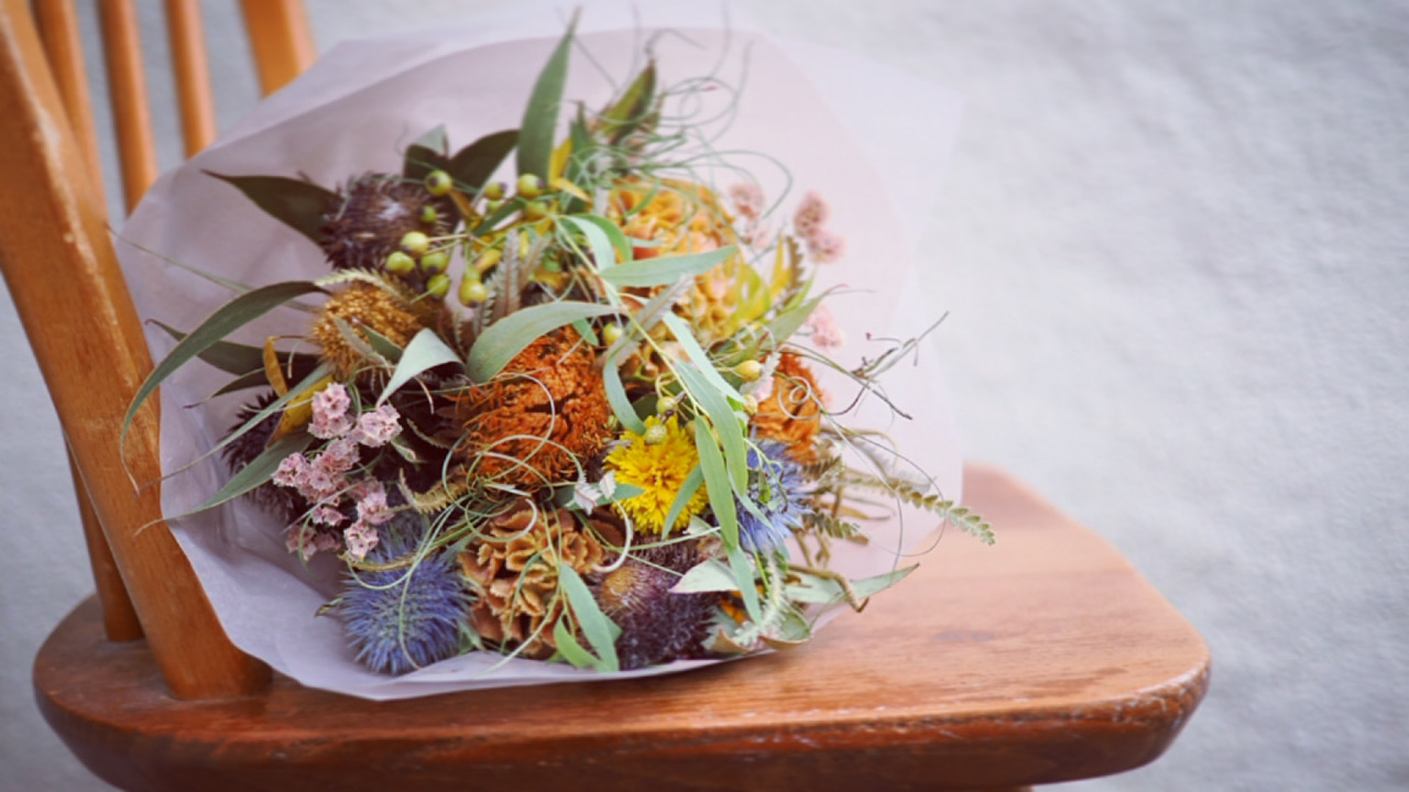 ブーケは、彩りある秋の花材に、セミドライやドライの花材もミックスしたオータムブーケを束ねます。