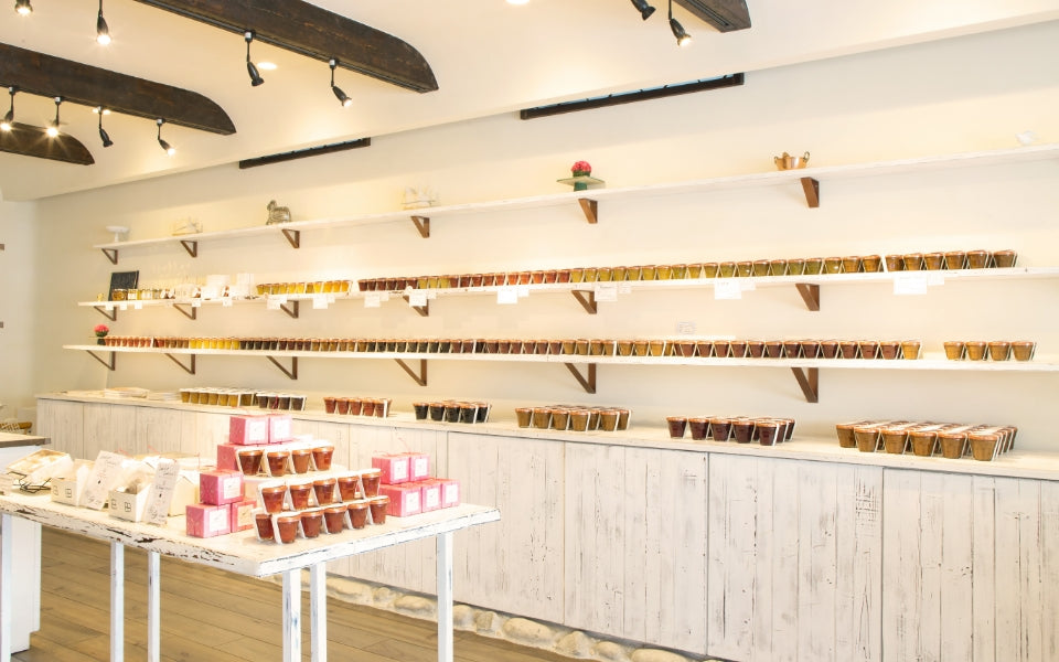 オリジナルレシピの「お菓子みたいなジャム」、バターや粉を吟味したサブレ、スコーンを、店内のアトリエで毎日おつくりしています。小さな小窓からはアトリエの様子もご覧いただけます。ご自宅から瓶をお持ちいただく量り売りジャムも人気。花屋台やクリスマスなどのシーズンイベントも盛りだくさんです。
